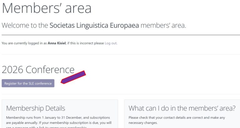 To register, go to SLE Members’ Area: https://societaslinguistica.eu/members/login/. Please note that registration is only open to members in good standing. If you haven’t yet paid your 2026 membership yet, please do so before registering for SLE2026.